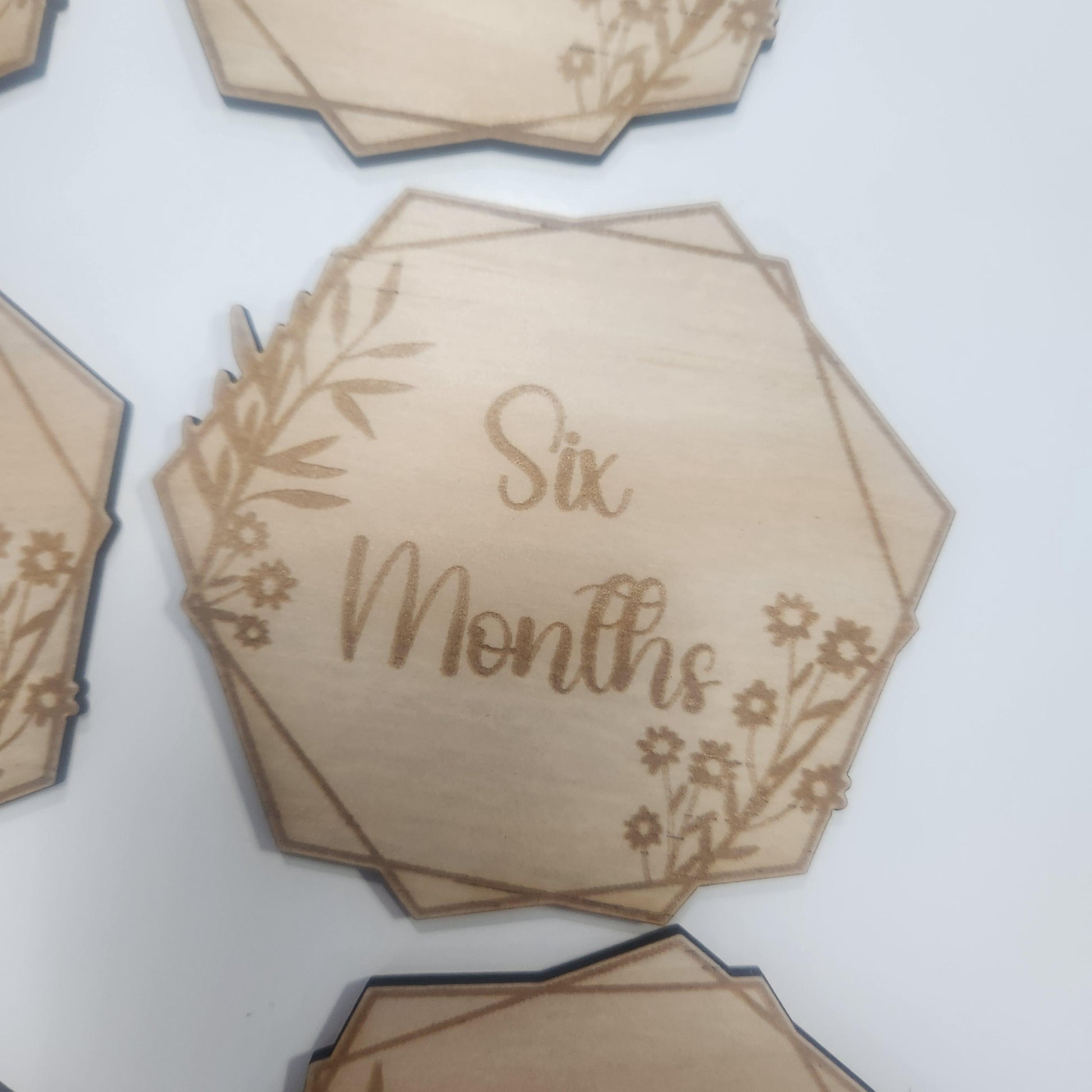Hexagonal Floral Monthly Milestone Plaques | Set of 17 Wooden Baby Discs | Handmade Baby Shower Gift