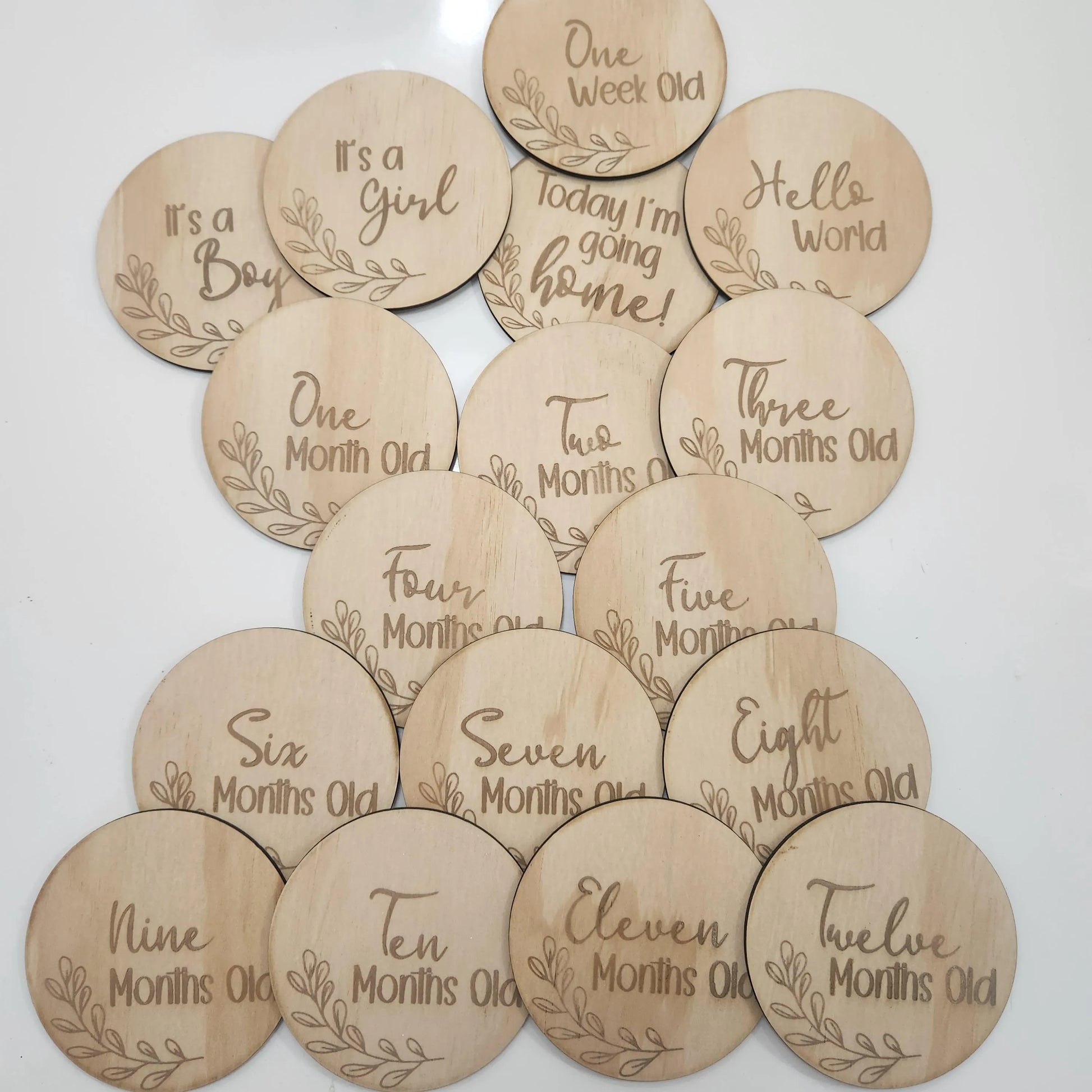 Classic Style Baby Milestone Plaque Bundle – 17 Engraved Disks | Hello World, Monthly Markers, and Birth Announcements